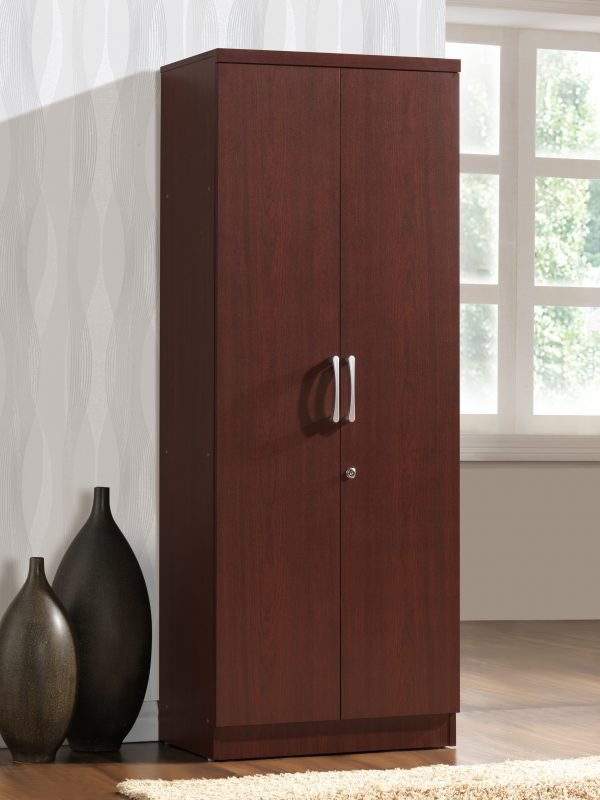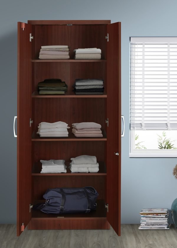 - The CHESTNUT MAHOGANY PANTRY CABINET adds a warm and refined touch to your kitchen or storage space. Its tall structure with deep mahogany finish, silver handles, and locking doors offers both elegance and secure functionality.