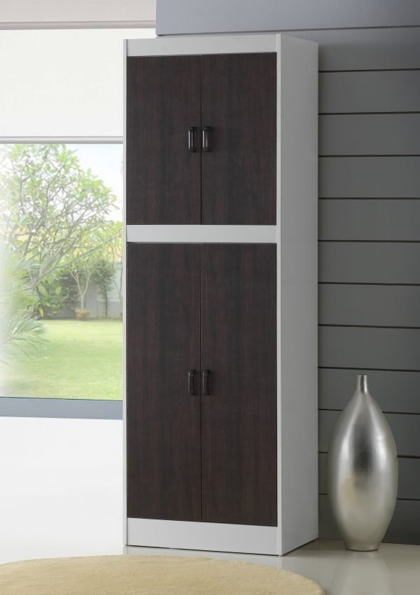 - The DUAL CABINET KITCHEN PANTRY UNIT provides generous vertical storage with a clean, modern aesthetic. It features two large compartments, each with double doors in a rich dark wood tone contrasted by a white frame. Perfect for organizing food, cookware, or household essentials in kitchens, utility rooms, or apartments.