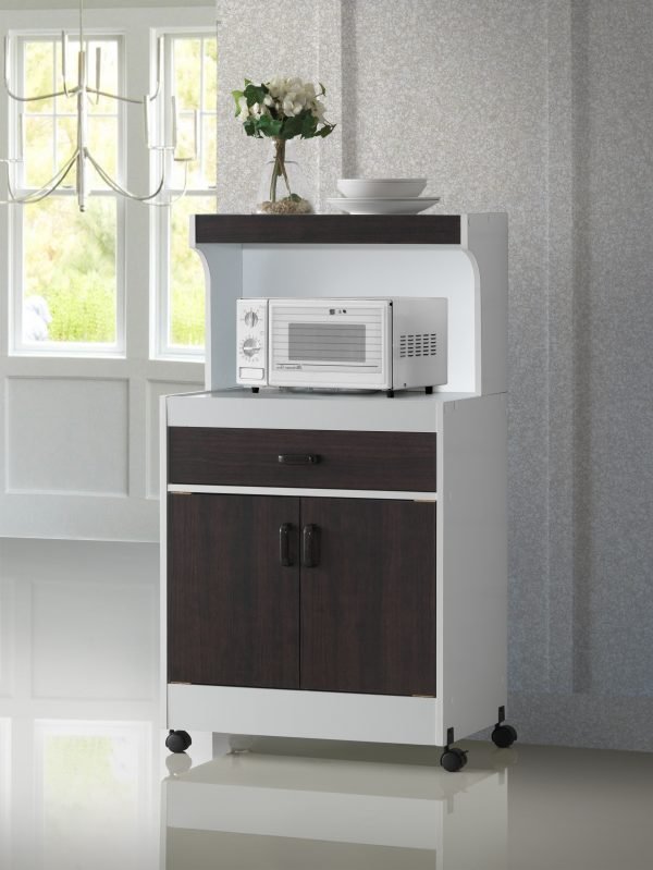 • The DUO TONE MICROWAVE STORAGE CART is a functional kitchen addition featuring a stylish white and dark wood finish. Designed with mobility in mind, it includes smooth-rolling casters, an open microwave shelf, a spacious drawer, and cabinet storage. Perfect for small kitchens or extra appliance space.
