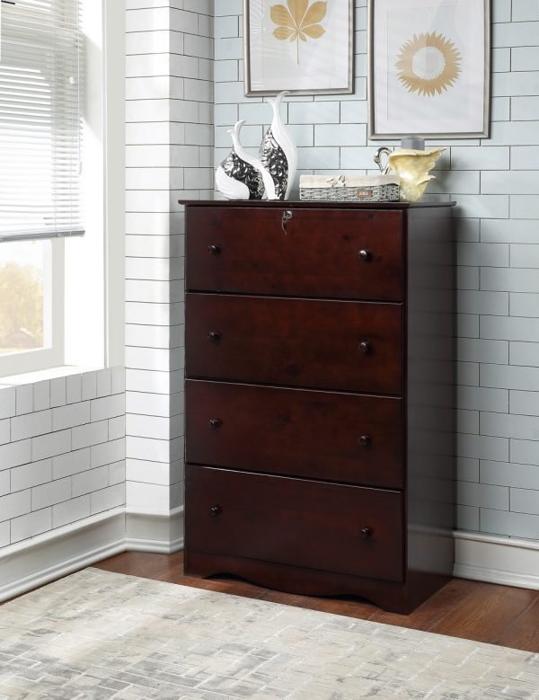 - The ESPRESSO 4-DRAWER COMPACT JUMBO CHEST brings sleek storage to smaller spaces. Its rich espresso tone and clean lines provide a bold, modern look, while four deep drawers—including a lockable top drawer—offer functional storage for clothes, documents, or essentials.