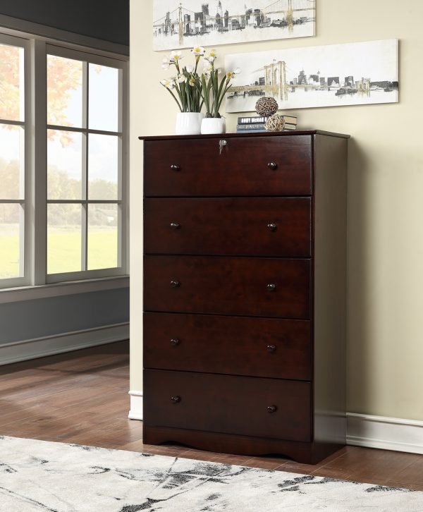 • The ESPRESSO TOWER 5-DRAWER LOCKING CHEST offers modern style with secure, spacious storage. Finished in a deep espresso tone, this vertical chest features five smooth-glide drawers including a top drawer with a lock—perfect for organizing personal items, clothing, or valuables with a sleek look.