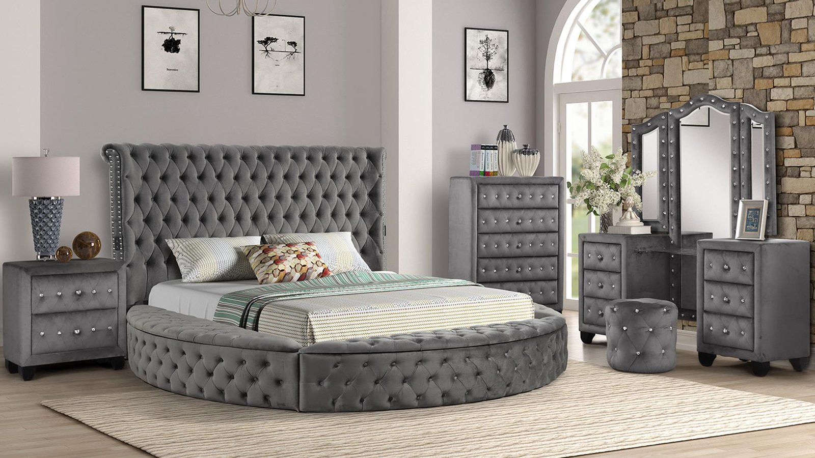 HAZEL KING 5 PC VANITY BEDROOM SET IN GRAY, HAZEL QUEEN 5 PC VANITY BEDROOM SET IN GRAY, HAZEL KING 4 PC VANITY BEDROOM SET IN GRAY, HAZEL QUEEN 4 PC VANITY BEDROOM SET IN GRAY, HAZEL KING BED GRAY, HAZEL QUEEN BED GRAY, SOPHIA VANITY SET GRAY, SOPHIA CHEST GRAY, SOPHIA NIGHTSTAND GRAY
