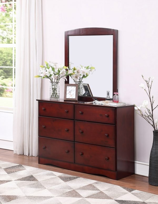 • The HERITAGE MAHOGANY DRESSER MIRROR SET showcases classic beauty with functional design. This set features a spacious six-drawer dresser with a warm mahogany finish and a matching framed mirror, perfect for traditional or transitional bedroom décor.