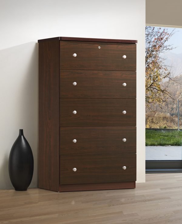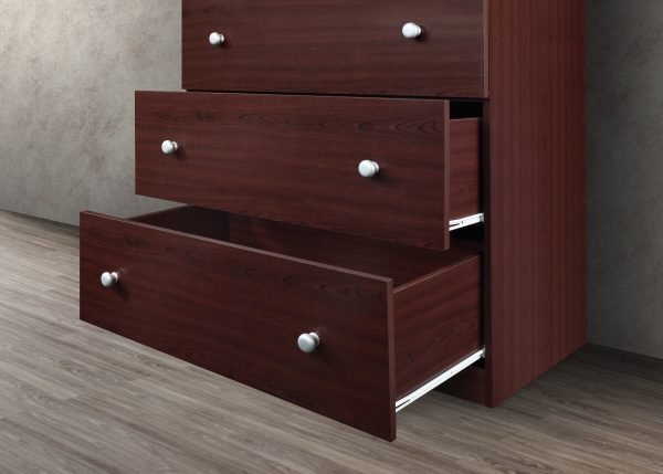 Rich mahogany 5-drawer jumbo chest with extra-deep storage drawers.