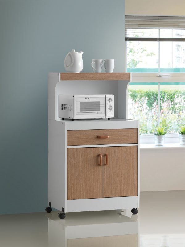 - The NATURAL WOOD FINISH MICROWAVE CART blends functionality with a clean, light-toned wood look. Equipped with smooth wheels, a drawer, dual-door cabinet, and a spacious microwave shelf, this piece fits perfectly in compact kitchens or multi-use spaces. Crafted with a white frame and light woodgrain accents for a fresh, contemporary appearance.