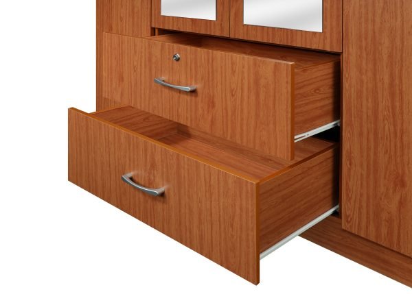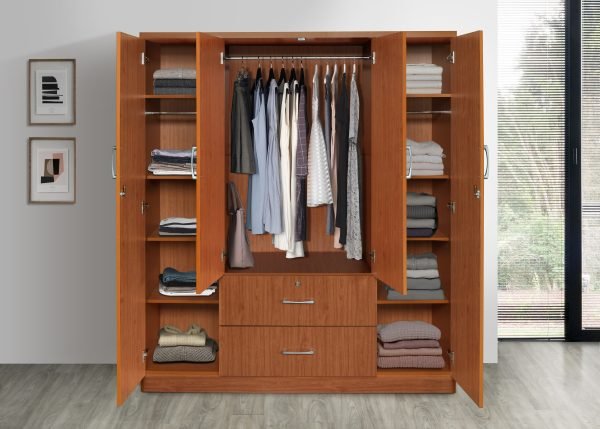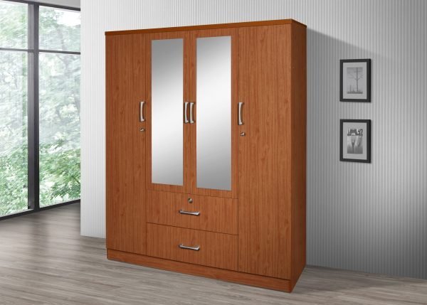 - The SIENNA CHERRY GRAND MIRROR WARDROBE delivers timeless design and ample storage. With four tall doors including two mirrored panels, three lockable drawers, and silver handles, this warm cherry wardrobe brings classic sophistication to your bedroom.