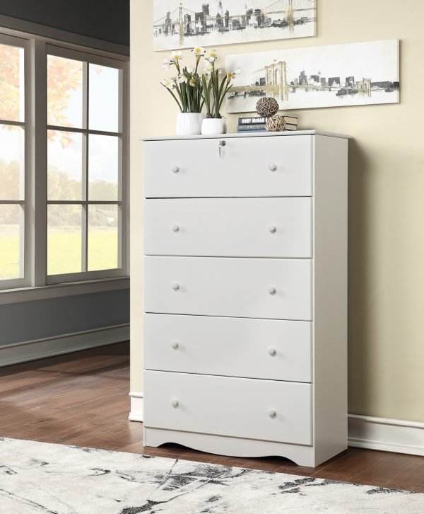 Large white 5-drawer chest with locking top drawer and sleek finish.